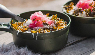 Viimeistele lehtikaalilastuilla, pikkelöidyllä punasipulilla ja parmesaaniraasteella.