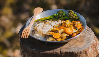 Tarvikkeet: Sytytä nuotio ja kuumenna pannu tulen yllä. Paista sitten perunoita, porkkanoita ja parsakaalia Muurikka Paistospray noin 10 minuuttia. Vihannesten tulee olla pehmeitä ja perunoiden rapeita. Siirrä sivuun, tarvittaessa alumiinifolioon, jotta lämpö säilyy.